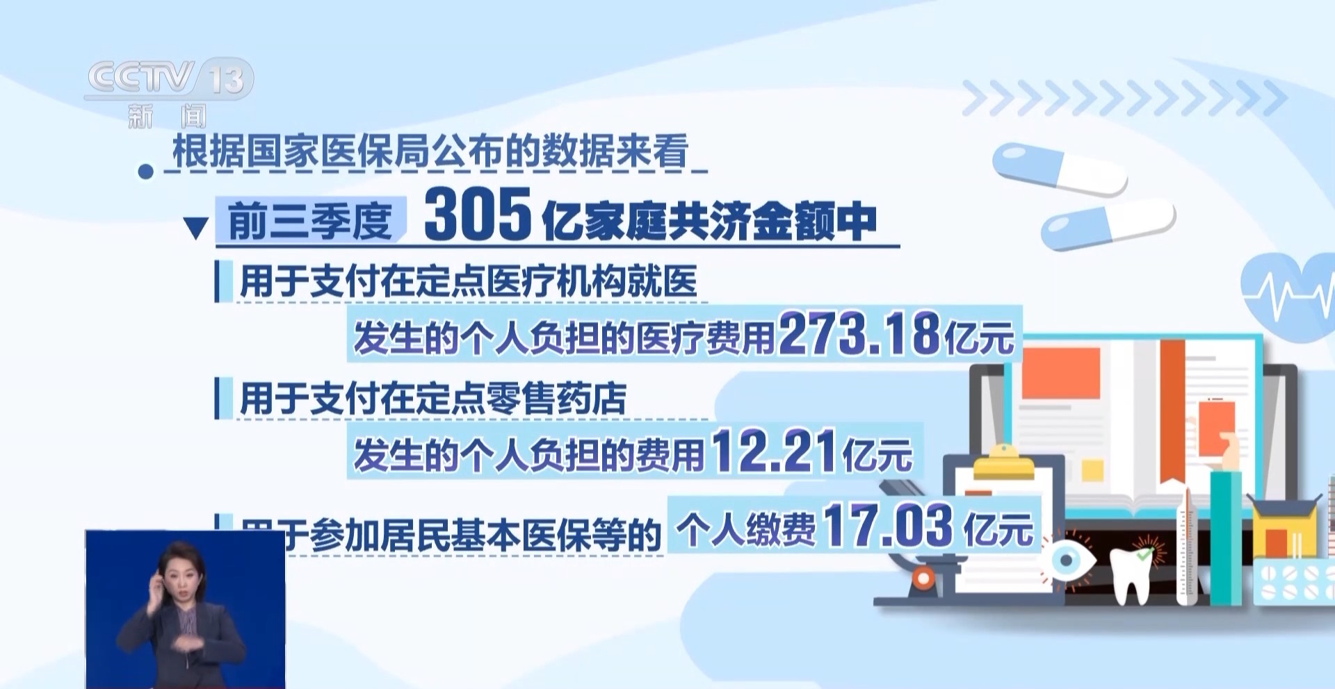 根據國家醫保局公布的數據來看,前三季度的305億家庭共濟金額中,用于支付在定點醫療機構就醫發生的個人負擔的醫療費用273.18億元,用于支付在定點零售藥店發生的個人負擔的費用12.21億元,用于參加居民基本醫保等的個人繳費17.03億元。