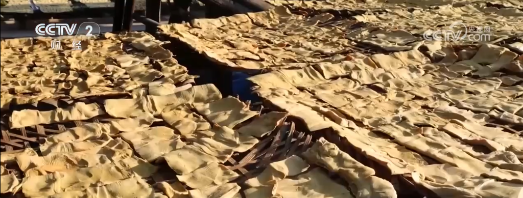 記者走進(jìn)田林縣六隆鎮(zhèn)就聞到濃濃的筍香。經(jīng)過幾個月的自然發(fā)酵,扁平、泛白的八渡筍被村民從筍倉中取出,在陽光下自然晾曬,各家房前屋后鋪滿了金燦燦的八渡筍筍干。
