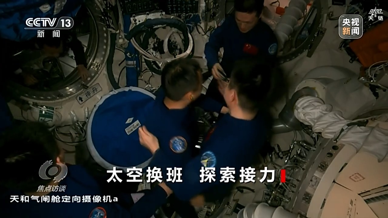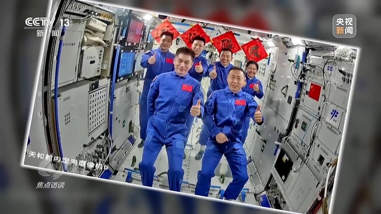 重返中國空間站的神十九航天員蔡旭哲打開艙門,再次體驗失重,他輕松地就從飛船進入空間站節點艙,和等待他們到來的神十八乘組來了一個大擁抱。第一次進入空間站的兩位“90后”航天員也同樣受到了熱烈的歡迎。在打掃一新的空間站核心艙,歡迎儀式必不可少。