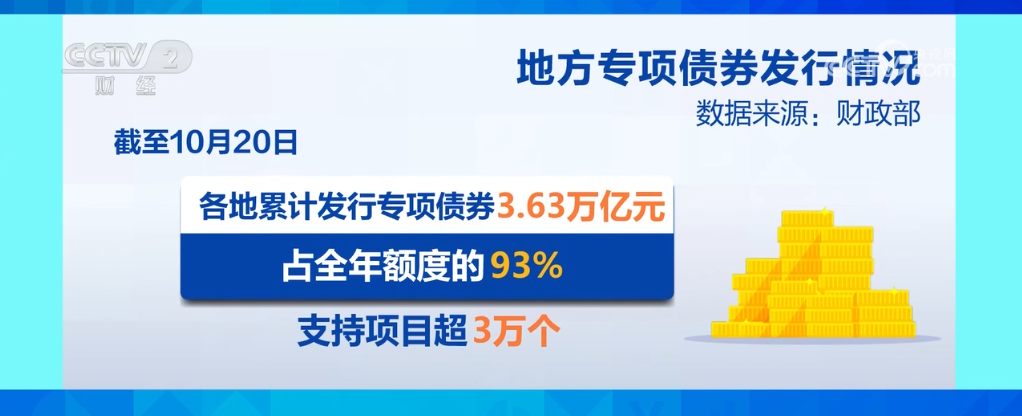數據顯示,9月份,全國一般公共預算支出、政府性基金預算支出同比分別增長5.2%和34.2%。同時,地方專項債券發行加速,9月發行約占全年額度的26%。截至10月20日,各地累計發行專項債券3.63萬億元,占全年額度的93%,支持項目超3萬個。