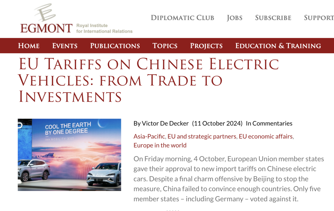 德德克10月11日文章《歐盟對中國電動汽車的關稅:從貿易到投資》截圖