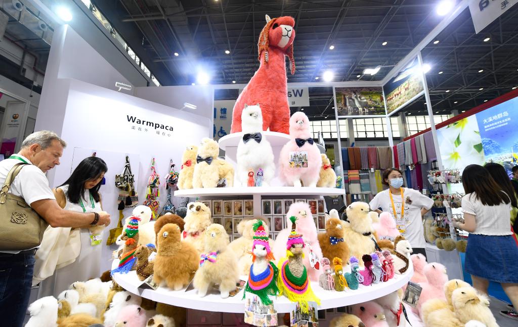 2021年5月7日,在海南海口舉行的首屆中國國際消費品博覽會(簡稱“消博會”)上,人們在秘魯“溫暖駝”展位參觀。