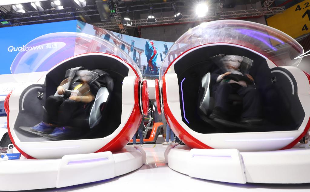 2022年11月5日,參觀者在第五屆進博會技術裝備展區體驗一款VR游戲座椅。新華社記者 方喆 攝