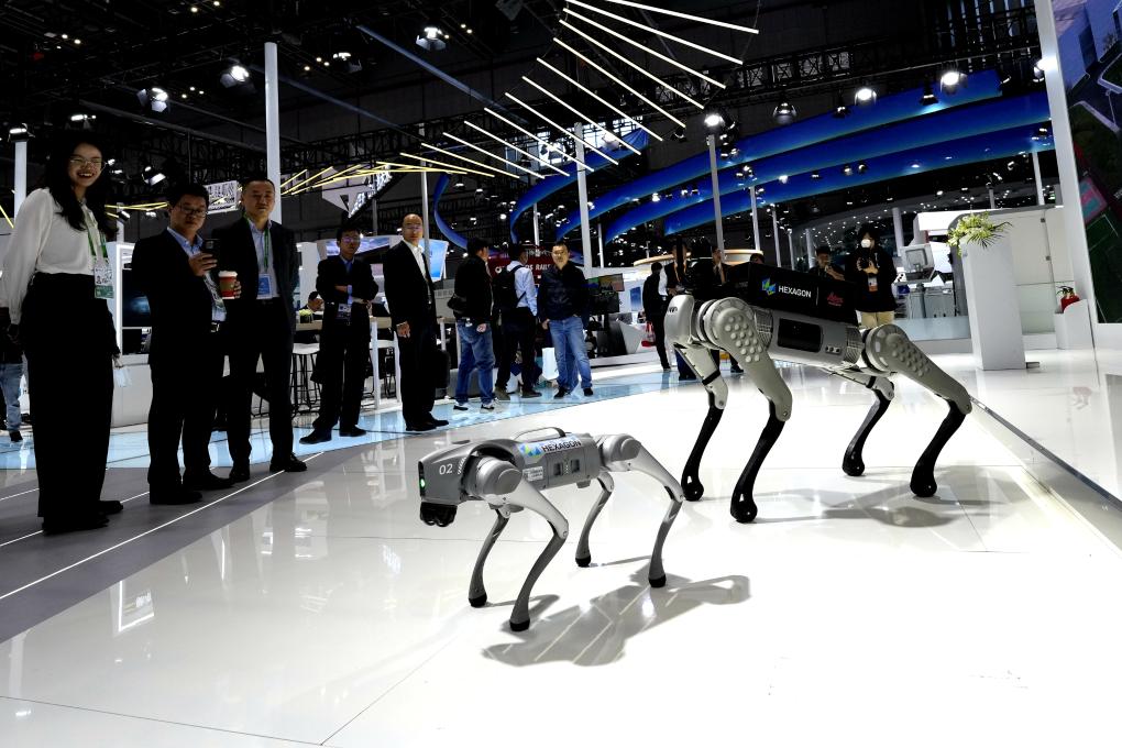 2023年11月7日,觀眾在第六屆進博會技術裝備展區觀看智能機器狗。新華社記者 張建松 攝