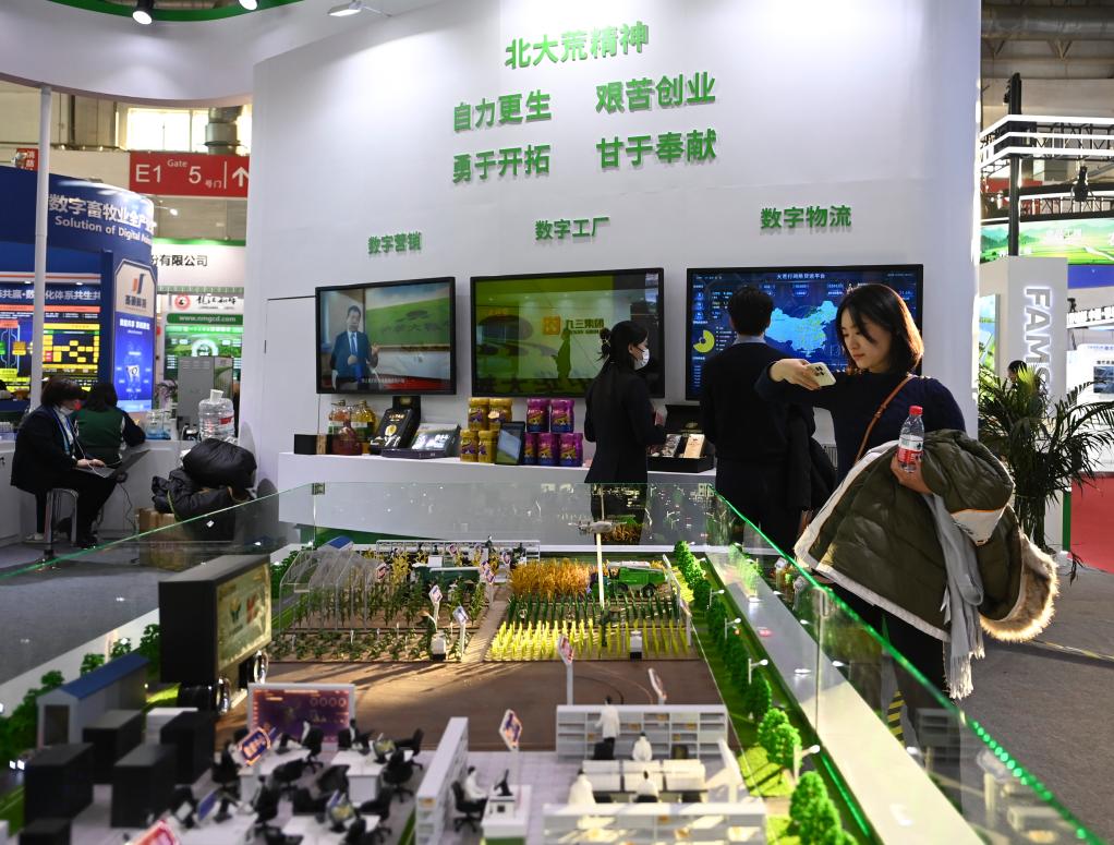 2023年11月30日,參觀者在首屆中國國際供應鏈促進博覽會(簡稱“鏈博會”)綠色農業鏈展區北大荒集團展臺前觀看智慧育種解決方案。新華社記者 蔡湘鑫 攝