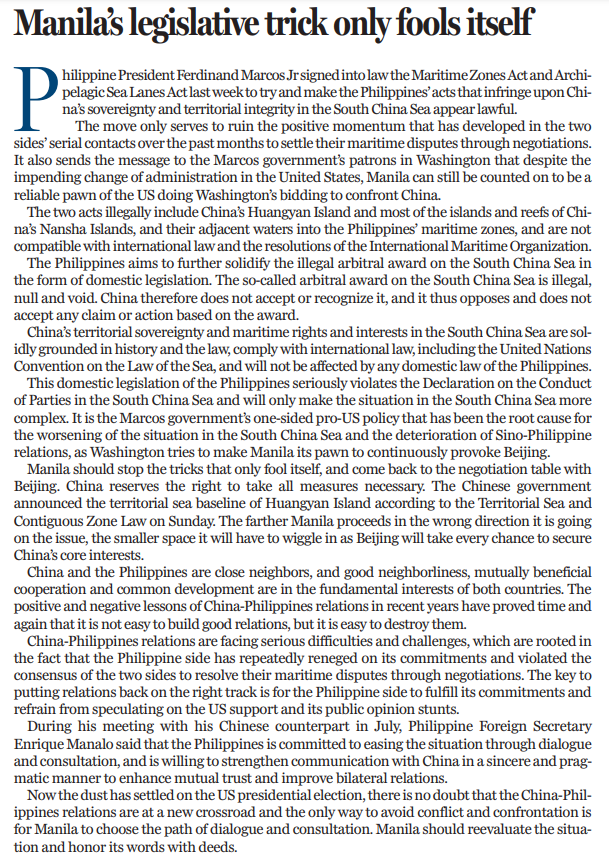 菲律賓總統馬科斯日前簽署“群島海道法”和“海洋區域法”,試圖“洗白”菲律賓在南海侵犯中國主權和領土完整的行為。