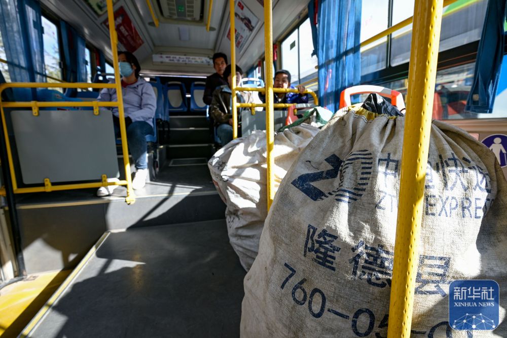 11月9日,隆德縣一輛公交車上裝有寄往鄉村的快遞。