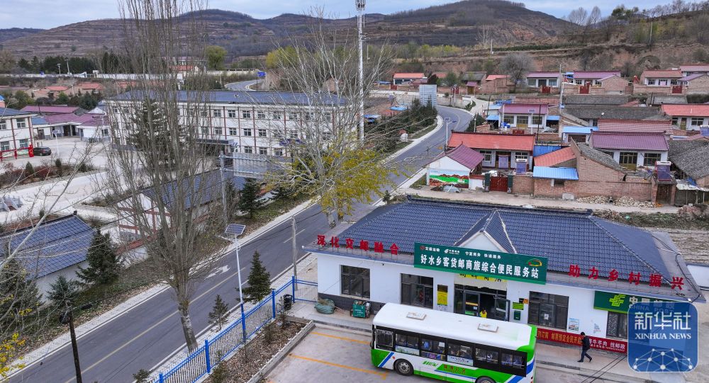 11月9日,一輛公交車停靠在隆德縣好水鄉客貨郵商旅綜合便民服務站,準備卸下快遞(無人機照片)。