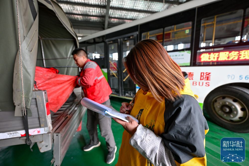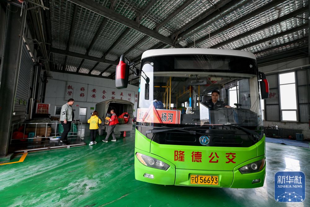 11月9日,一輛載有快遞物品的城鄉公交車從隆德公交公司倉庫駛出。