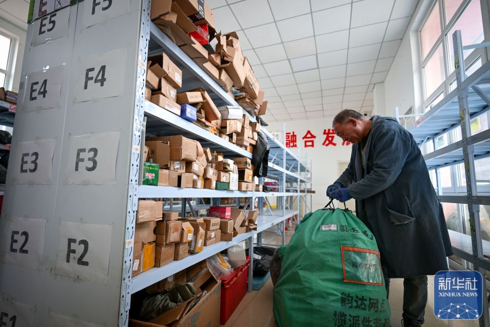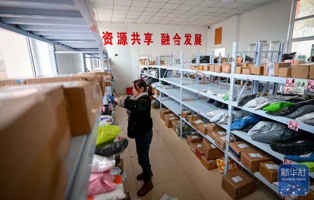 11月10日,隆德縣聯財鎮客貨郵商旅綜合便民服務站工作人員在整理快遞。