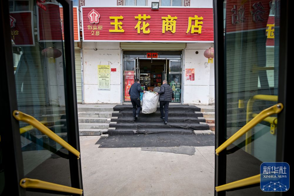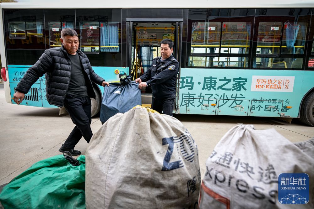 11月10日,隆德縣公交車司機(左)和聯財鎮聯合村快遞點經營者將快遞卸下公交車。