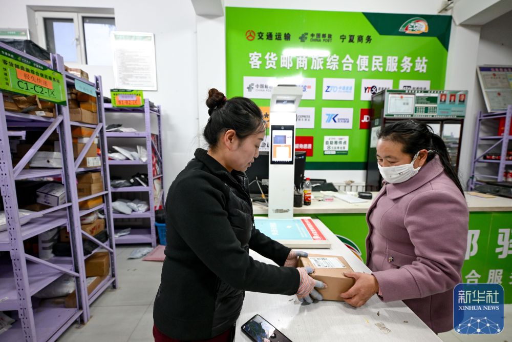 11月9日,村民(右)在隆德縣沙塘鄉客貨郵商旅綜合便民服務站取快遞。