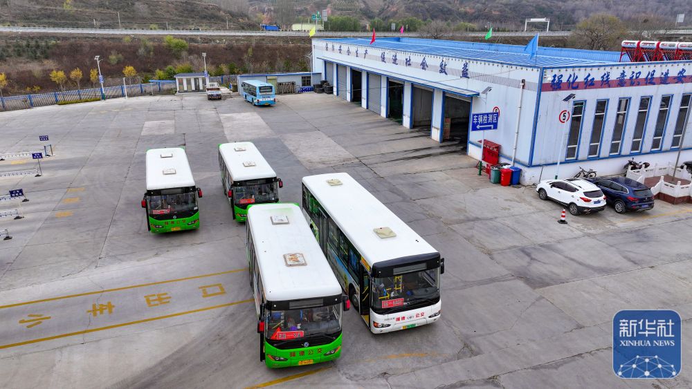 載有快遞物品的城鄉公交車即將從隆德縣公交公司駛出(11月9日攝,無人機照片)。