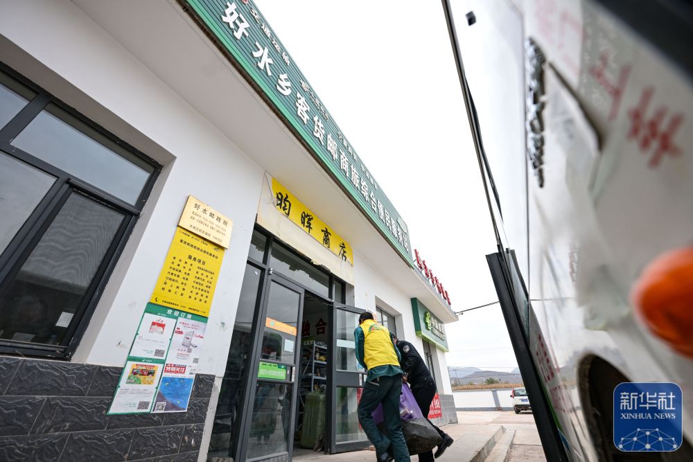 11月9日,隆德縣公交車司機和好水鄉客貨郵商旅綜合便民服務站經營者從公交車上卸下快遞物品。