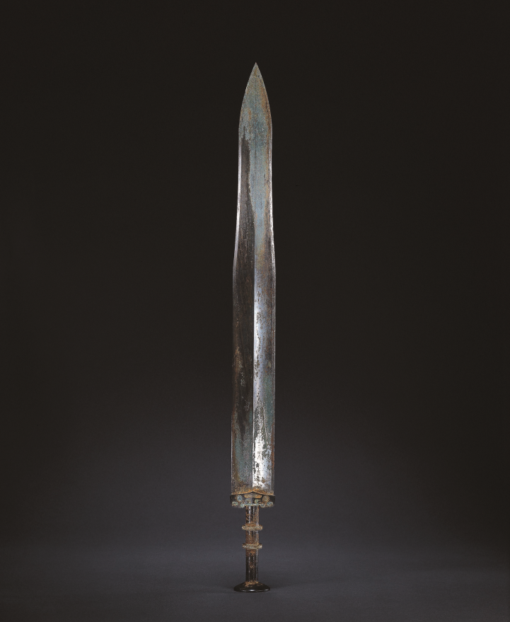 包括吳王夫差劍在內,10年前古越閣共有58件青銅兵器入藏蘇博,其中27件為有償征集,在蘇州市政府的支持下,蘇博共出資4250萬元;另有31件為古越閣主人王振華、王淑華夫婦慷慨捐贈。這批兵器包括劍、戈、矛、鉞、弩弓等各個門類,除吳王夫差劍外,珍貴文物還包括越王者旨于賜劍和越王州句劍,者旨于賜是越王勾踐的兒子,在位僅6年;州句是勾踐的曾孫,在位36年極有作為,使越國重新占領江淮地區,勢力從江南擴展到山東。另一件鎏金菱形紋劍,劍身遍布金色紋飾,極為華麗,這種工藝的青銅劍此前在傳世品或考古發掘中均未有過,為豐富青銅兵器史提供了珍貴的實物。