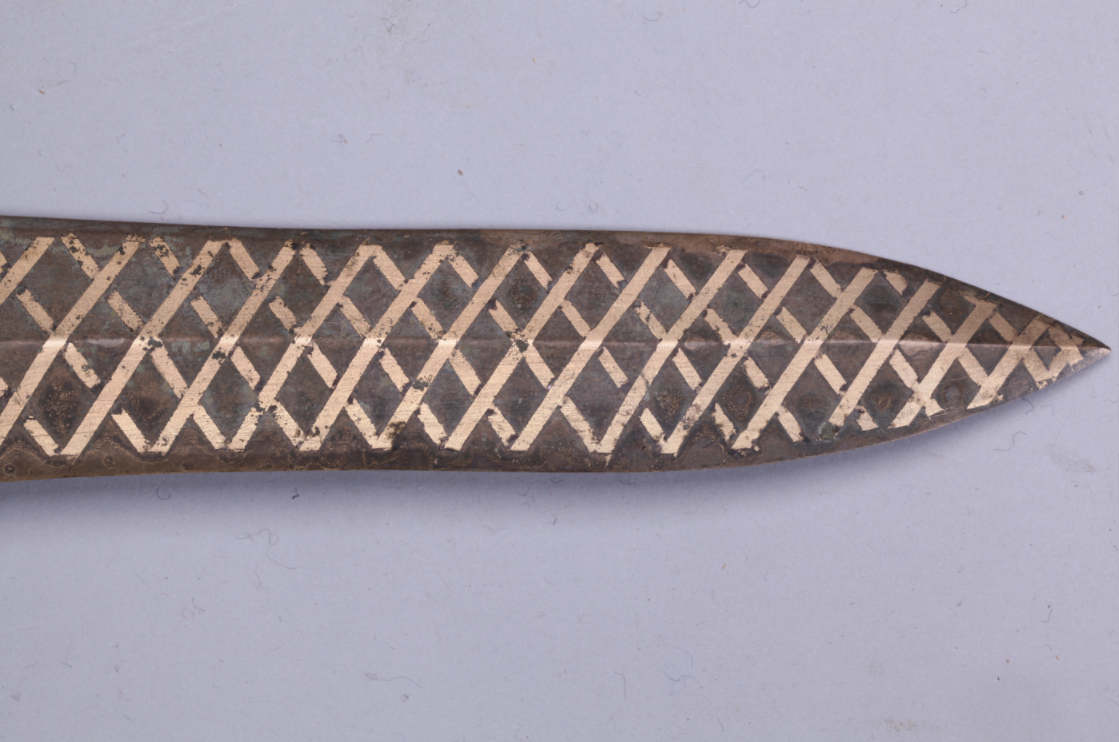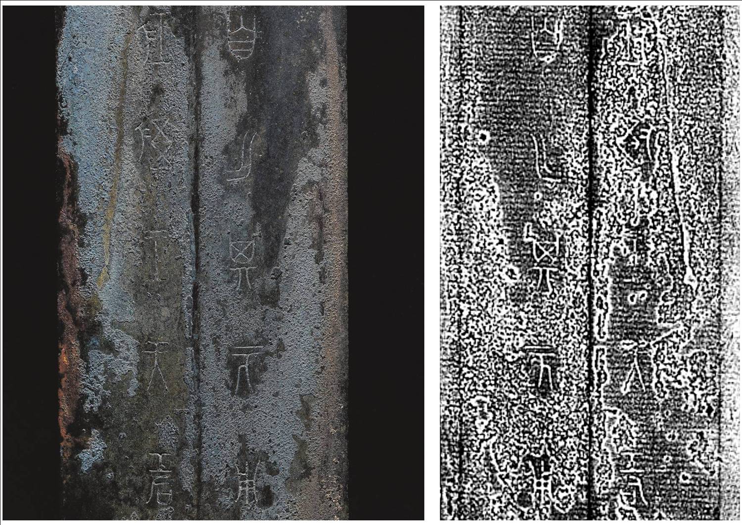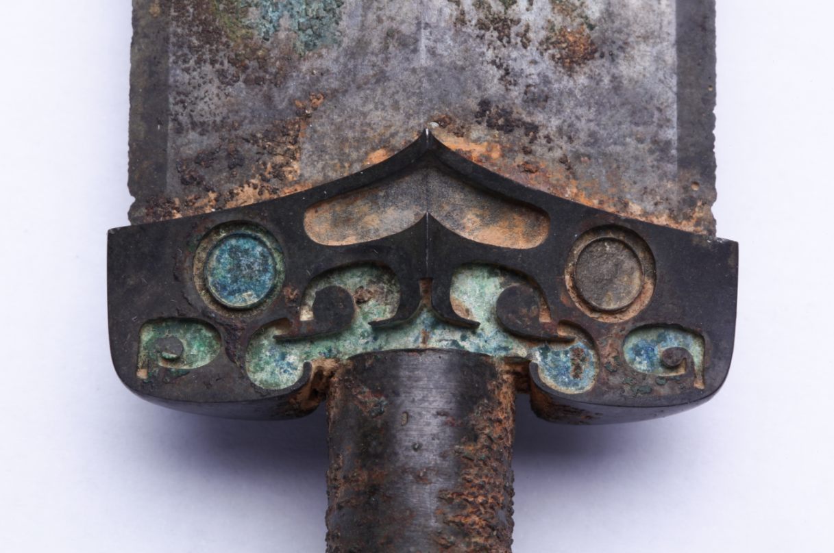 這把青銅劍通長58.3厘米,劍身寬大厚重,在前部有一個明顯變窄,可以提高劍的刺穿能力,劍尖雖然只有極尖銳的一點,但不可思議的是,在高倍放大鏡下仍然可以看出有六至八個截面。劍身雖然光素,仔細觀察會發現寶劍通體泛著幽幽的神秘藍光,劍格上鑄出獸面紋,鑲嵌的綠松石有一面已經脫落,劍身近格處鑄有兩行銘文:“攻敔(吳)王夫差自乍(作)其元用”,表明這把劍的擁有者是吳國歷史上大名鼎鼎的吳王夫差。