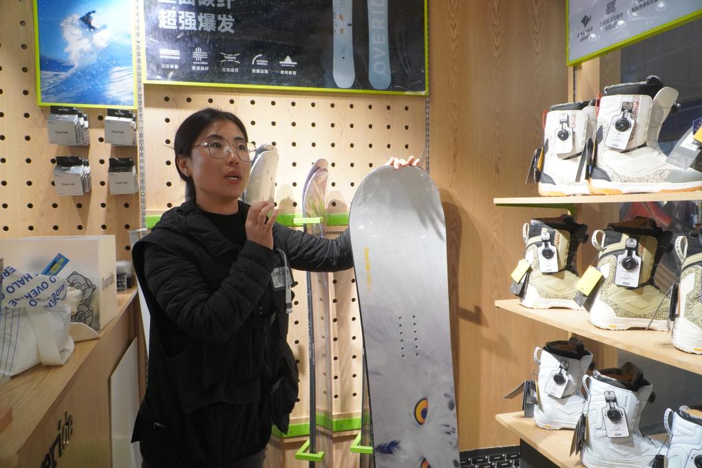 位于吉林省北大湖滑雪度假區的國產滑雪裝備品牌Overide門店內,店長賈曉娜在介紹滑雪板性能。新華社記者孫逸軒 攝