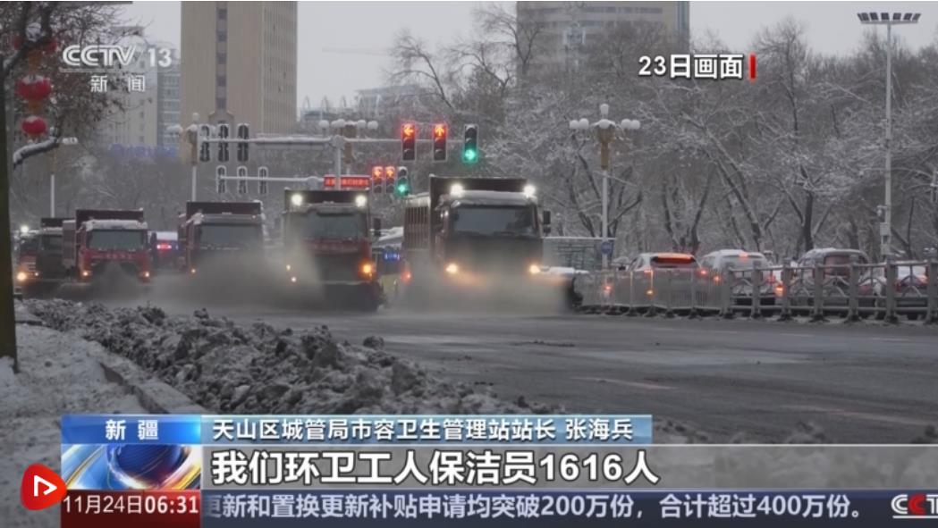 11月22日下午到11月23日16時(shí),烏魯木齊迎來(lái)降雪,最大積雪深度達(dá)20厘米。城管部門(mén)連夜作業(yè),快速出動(dòng)大型清雪車(chē)輛和環(huán)衛(wèi)工人進(jìn)行清雪。