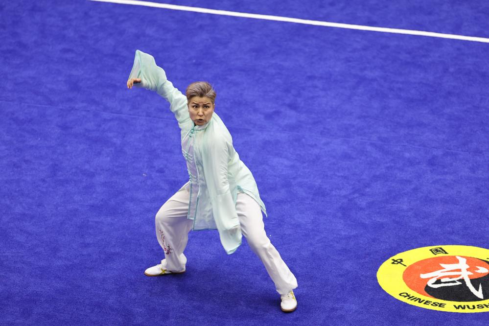 一襲素色的武術服,衣袖微微飄揚,維吾爾族女選手地里娜爾·地里夏提的步伐穩健扎實,拳法充滿力量與自信。