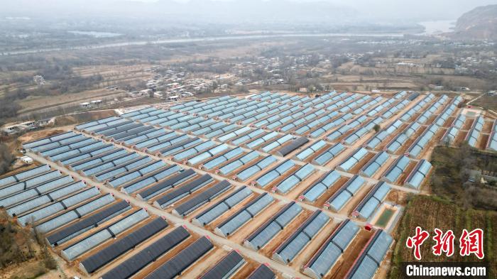 11月21日,航拍甘肅省積石山縣大河家鎮韓陜家村集中安置點后續產業——高效節能日光溫室蔬菜大棚。九美旦增 攝