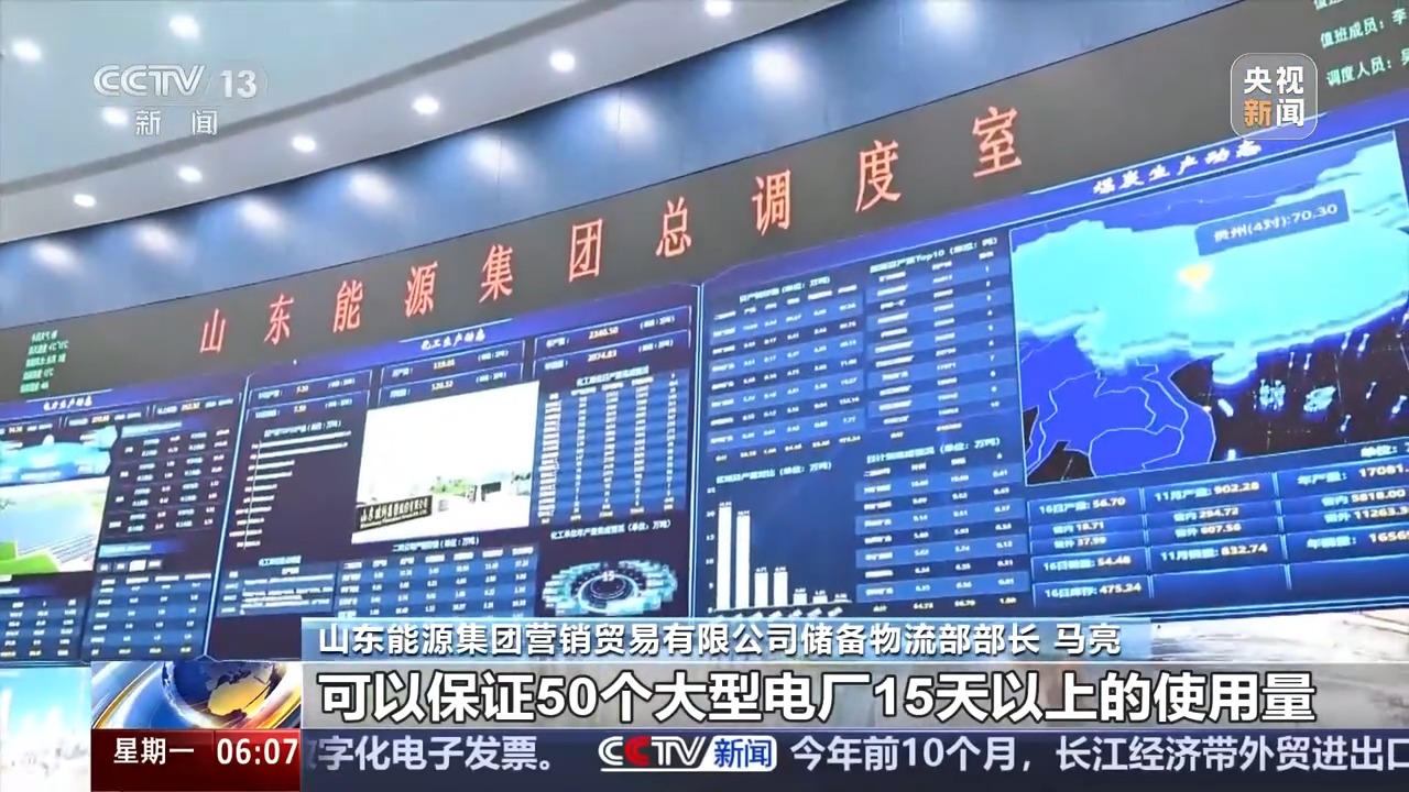山東能源集團營銷貿易有限公司儲備物流部部長 馬亮:可調度煤炭儲備完成504.67萬噸,可以保證50個大型電廠15天以上的使用量。