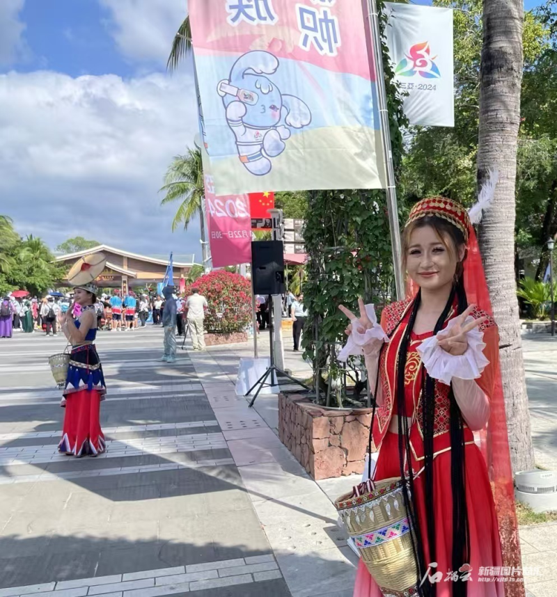 歡迎儀式的人群中,一頭麻花辮的艾麗非熱·艾爾肯非常引人注意,很多運動員前去與她合影,“我們排練一個月了,我要用最好的狀態為運動員加油,今天看見了很多家鄉的運動員,特別激動,等我表演完就去找他們合影。”艾麗非熱介紹,她家在新疆阿克蘇,在三亞理工職業學院上大二,這幾天每天都在關注運動會的各類信息。