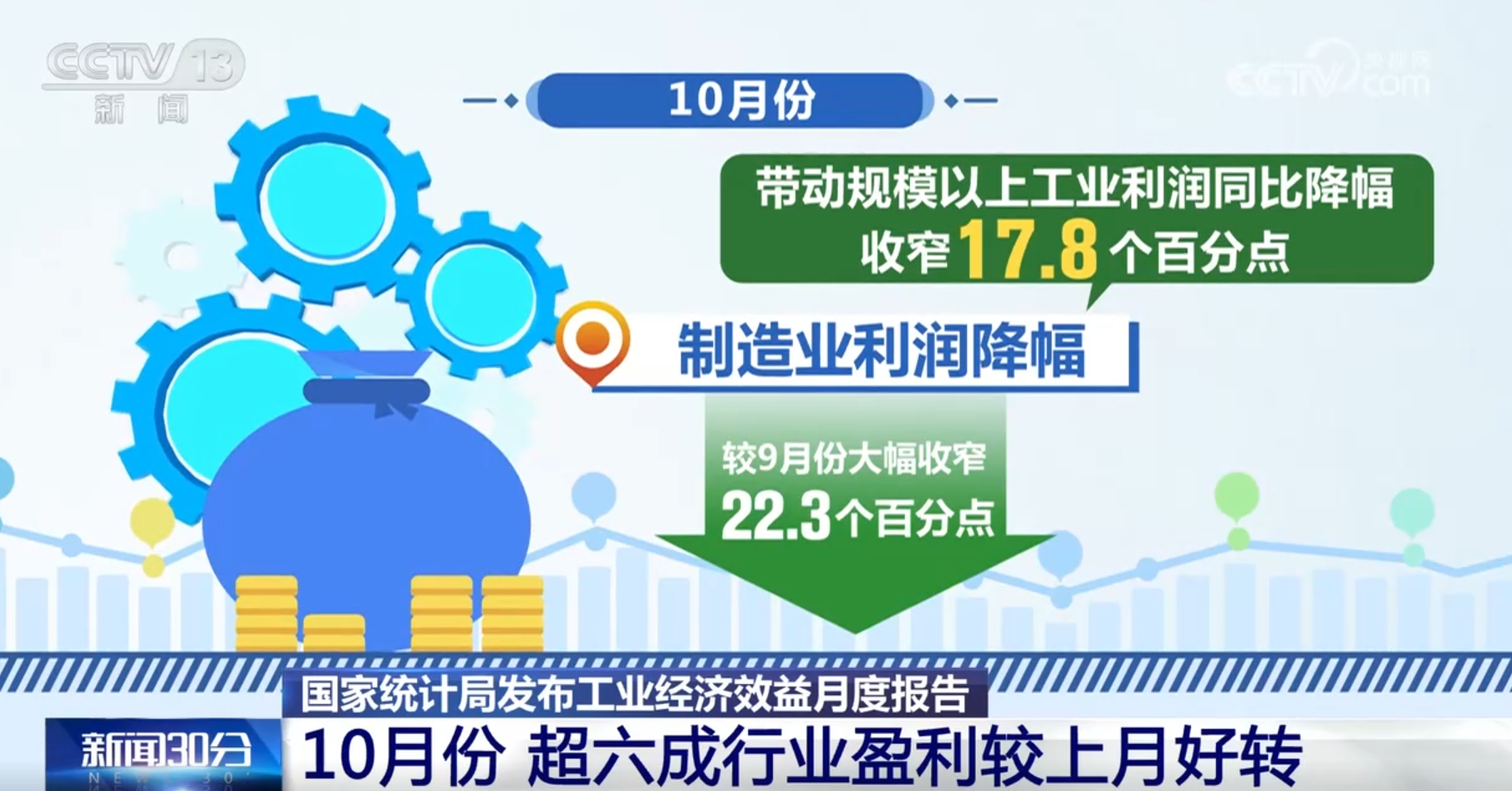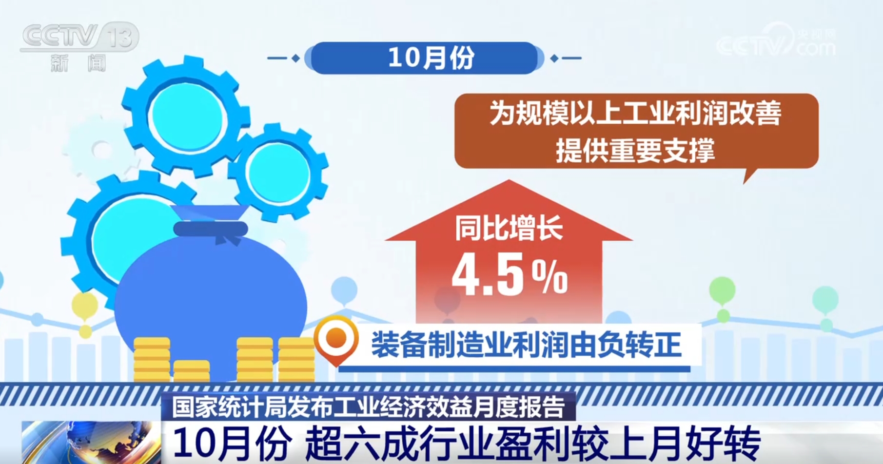 國家統計局最新發布的數據顯示,10月份,隨著存量政策及一攬子增量政策協同發力、持續顯效,規模以上工業企業生產穩定增長,企業利潤當月降幅明顯收窄,多數行業盈利較上月好轉。
