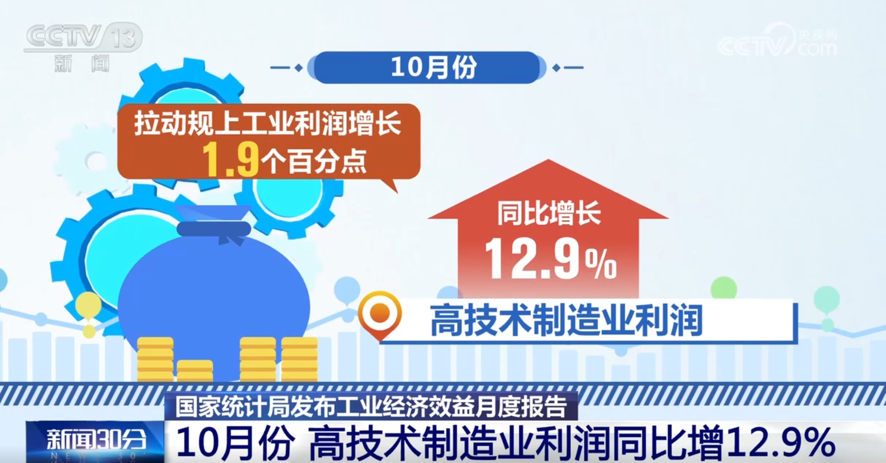 高技術制造業支撐和帶動作用顯現,10月份,高技術制造業利潤同比增長12.9%,拉動規上工業利潤增長1.9個百分點。其中,可穿戴智能設備制造、敏感元件及傳感器制造等行業利潤同比分別增長73.3%、48.8%。