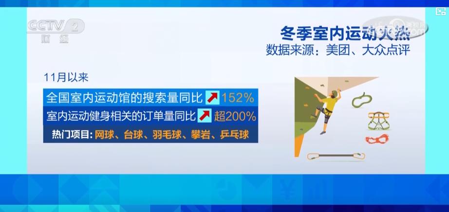 數據顯示,11月以來,全國室內運動館的搜索量同比增長152%,與室內運動健身相關的訂單量同比增長超200%,網球、臺球、羽毛球、攀巖、乒乓球是其中的熱門項目。