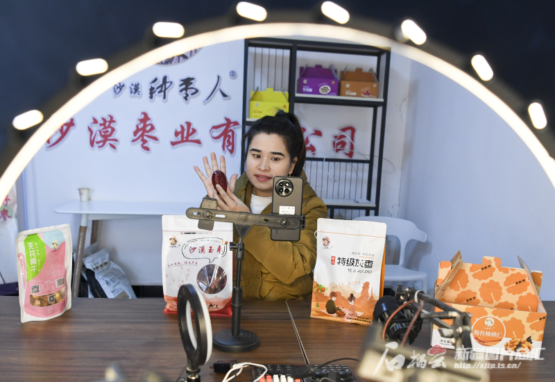 11月29日,策勒縣智慧果業農民專業合作社員工在直播銷售大棗。