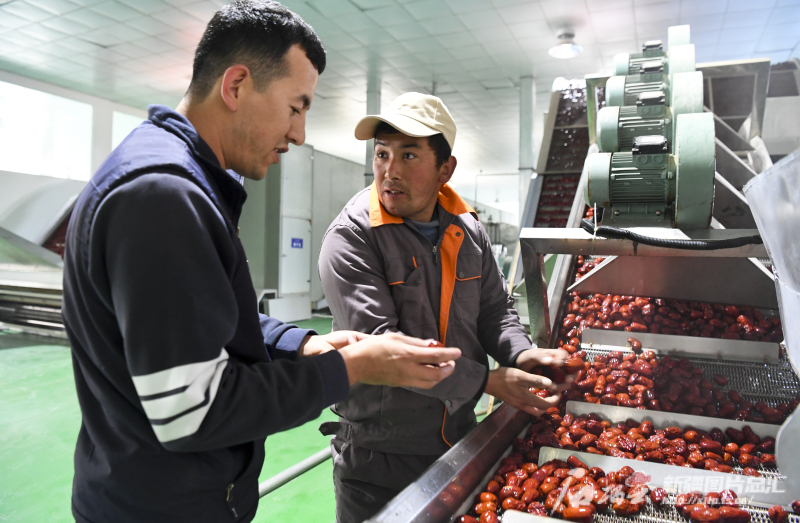 11月29日,策勒縣智慧果業農民專業合作社員工在查看紅棗烘干情況。