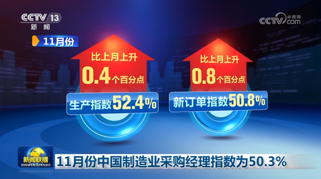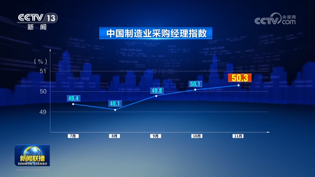 11月份中國制造業采購經理指數為50.3%,比上月上升0.2個百分點。
