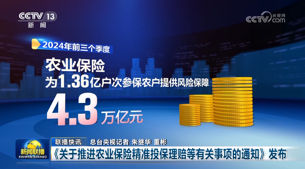 金融監管總局等四部門近日聯合發布通知,對農業保險投保理賠、應收保費、條款費率、數據共享等提出要求,進一步提高投保理賠精準性,推動我國農業保險高質量發展。今年前三個季度,農業保險為1.36億戶次參保農戶提供風險保障4.3萬億元。