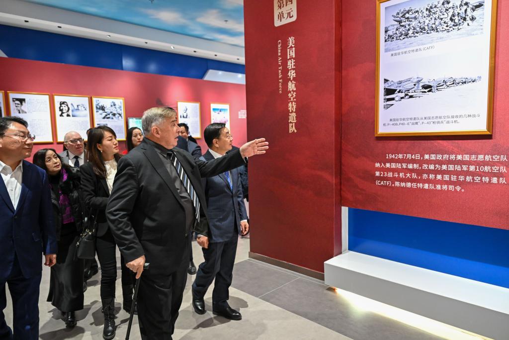 11月30日,美中航空遺產基金會代表團成員在烏魯木齊文化中心展覽館觀看“銘記英雄——飛虎隊主題歷史圖片展巡展(新疆)”。新華社記者 丁磊 攝