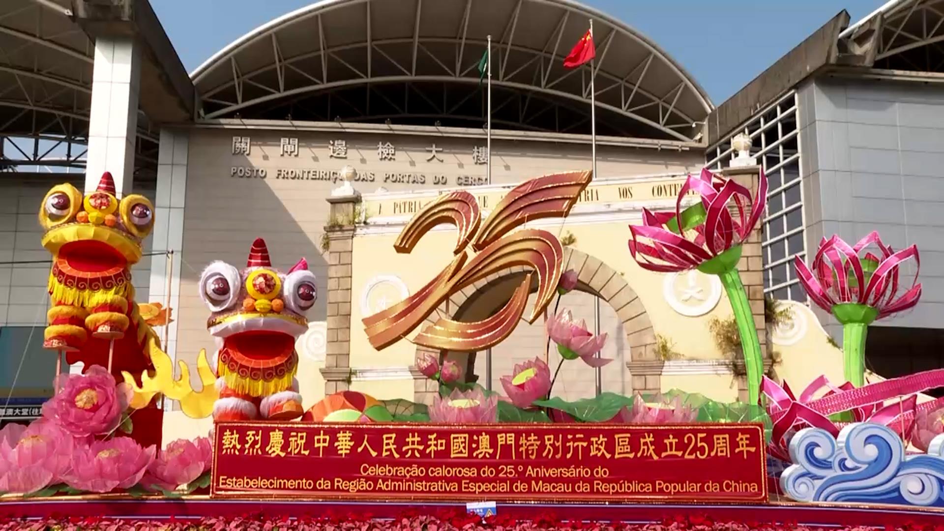 鮮艷的五星紅旗和澳門特區(qū)區(qū)旗迎風(fēng)飄揚(yáng)