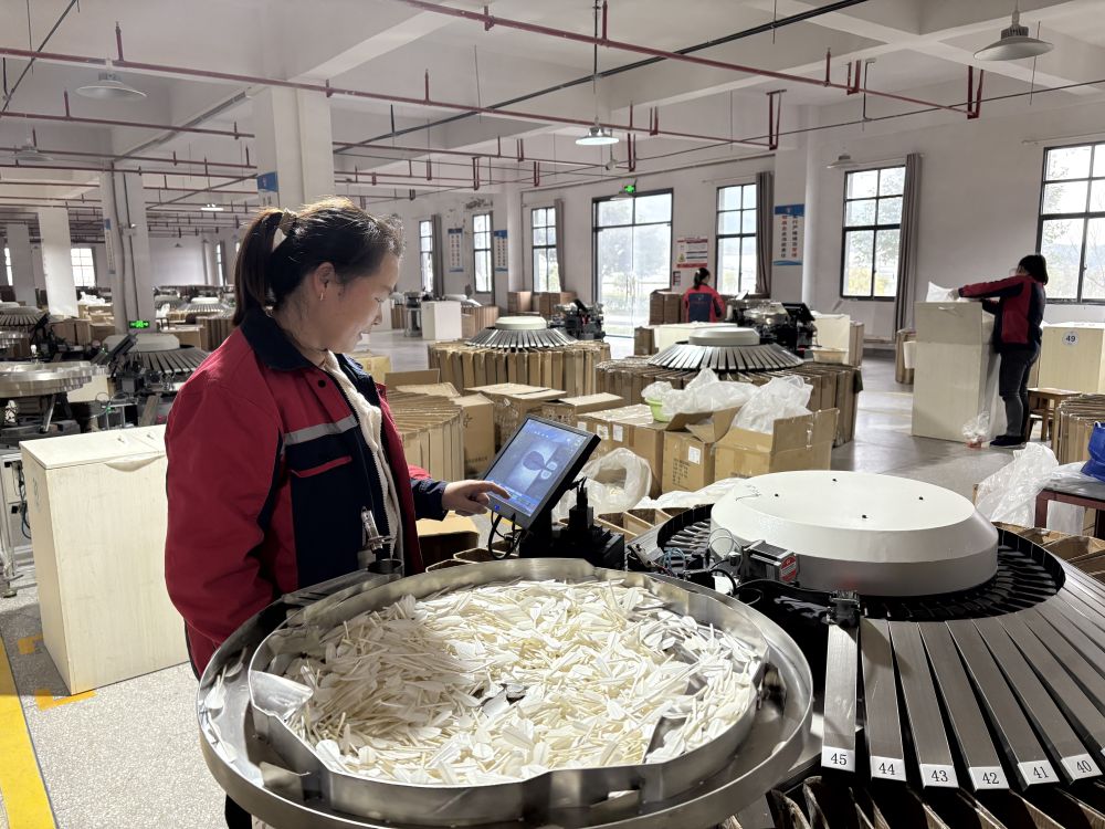 在貴州亞獅龍產業園,工人正在操作羽毛球毛片彎拱分選機。新華社記者 李凡 攝