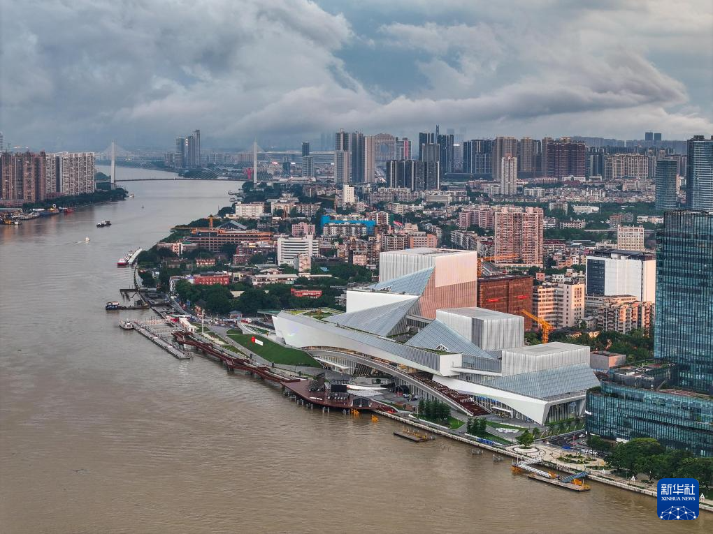 白鵝潭大灣區藝術中心宛如“文化巨輪”揚帆珠江(2024年4月27日攝,無人機照片)。