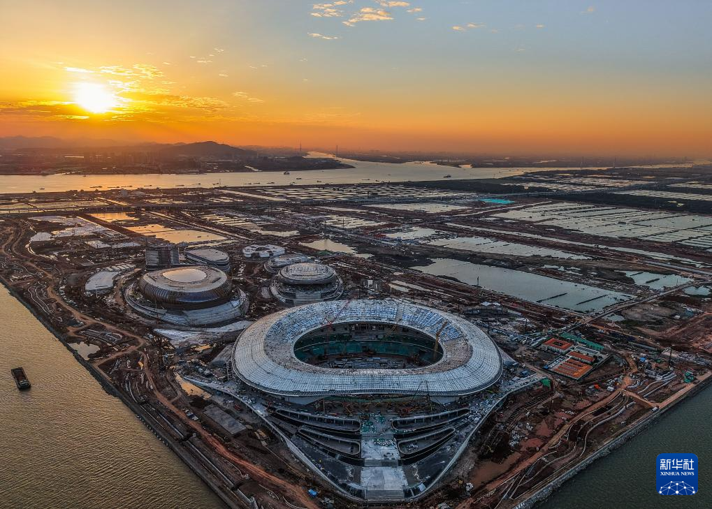 位于粵港澳大灣區“地理幾何中心”的廣州南沙全民文化體育綜合體建設進展順利(2024年11月27日攝,無人機照片)。