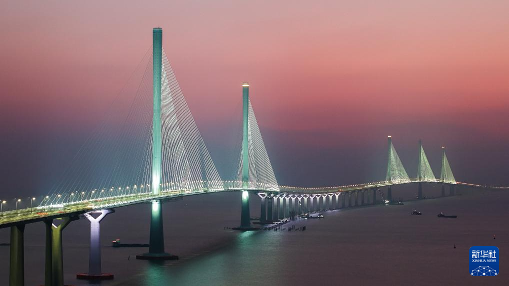 暮色中的黃茅海跨海通道高欄港大橋(左側雙主塔)和黃茅海大橋(右側三主塔)(2024年12月7日攝,無人機照片)。