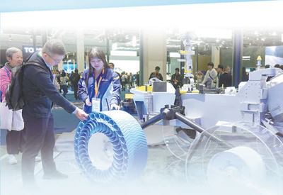第七屆中國國際進口博覽會上,觀眾正在了解米其林月球探測車輪胎。 唐 克攝
