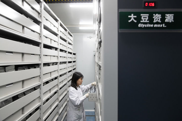 2024年4月2日,工作人員在國家寒帶作物及大豆種質資源中期庫(哈爾濱)查看大豆種質情況。新華社記者 張濤 攝
