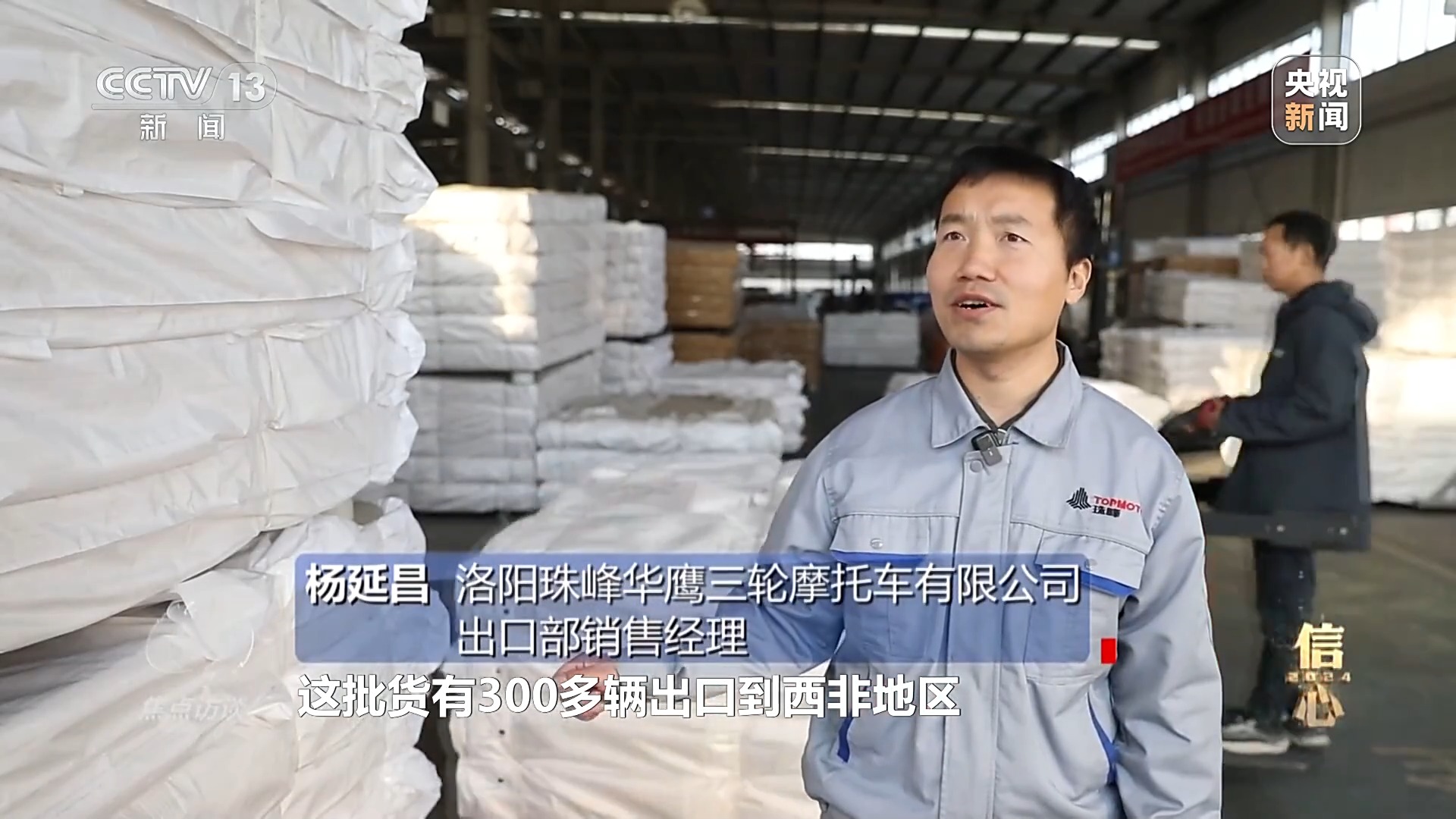 洛陽珠峰華鷹三輪摩托車有限公司出口部銷售經理 楊延昌:“這批貨有300多輛出口到西非地區,目前訂單量已經達到了3萬臺,排到了25年3月份。”