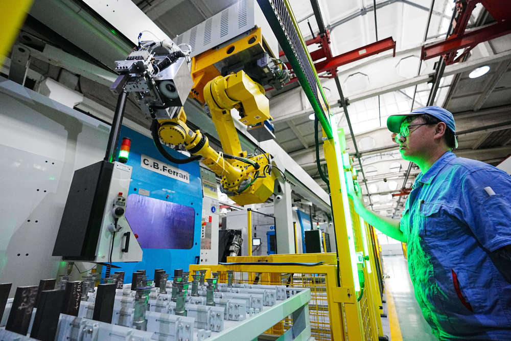 7月23日,在哈電集團哈爾濱汽輪機廠有限責任公司葉片加工智能化車間,工作人員在觀察智能機械臂運行情況。近年來,東北三省加大力度推進傳統制造業數字化改造,依靠科技創新“第一動力”,聚焦“卡脖子”領域,讓傳統產業增“智”提“質”。(新華社記者 王建威 攝)