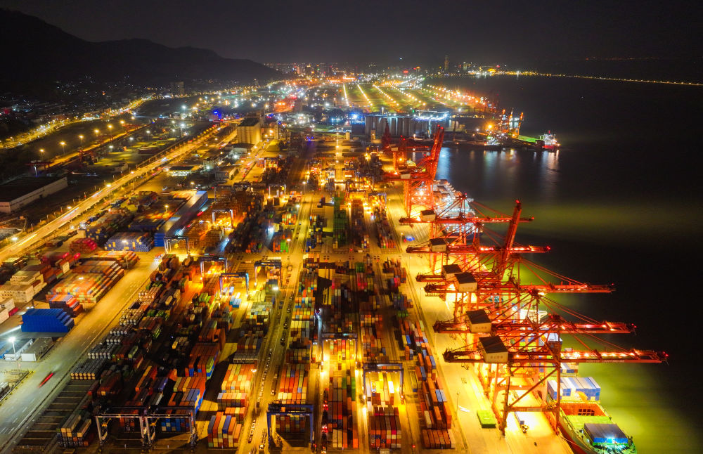 當日,夜幕下的江蘇連云港港集裝箱碼頭燈火明亮,工作人員繁忙有序地進行裝卸工作。臨近年末,江蘇連云港港持續提升港口集疏運水平,多措并舉加快貨物裝卸轉運效率,力爭外貿集裝箱吞吐量與出口量再創新高。