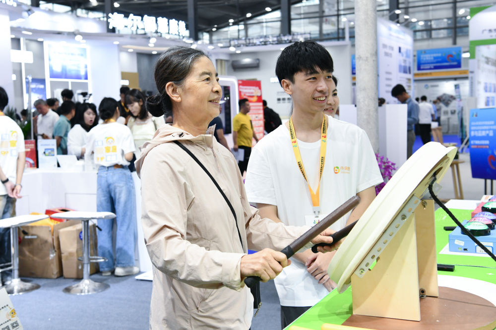 10月27日,老人在2024深圳國際智慧養老產業博覽會上體驗樂齡鼓。(新華社記者 梁旭 攝)