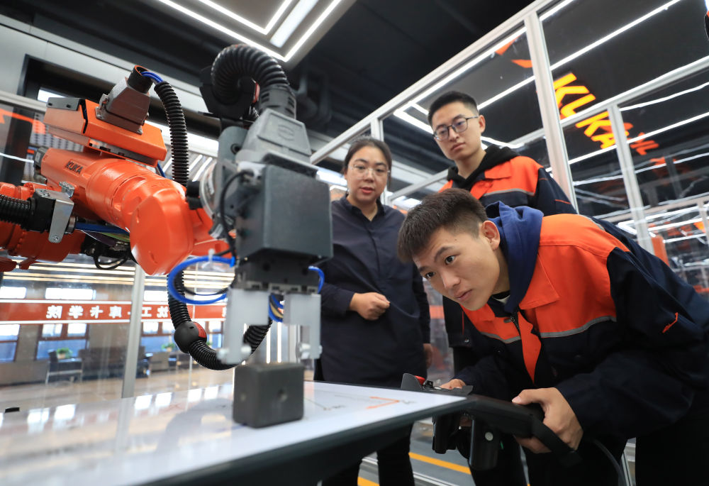 產教融合促就業。11月22日,沈陽工學院電氣工程及自動化專業學生操作機器人進行物料碼垛實訓。(新華社記者楊青攝)