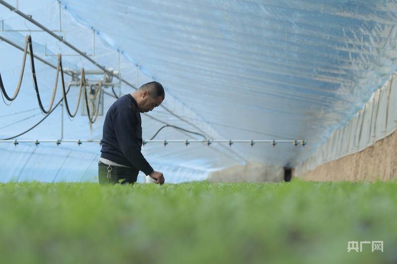 溫室大棚里農戶在管理幼苗(央廣網發 劉九維 攝)
