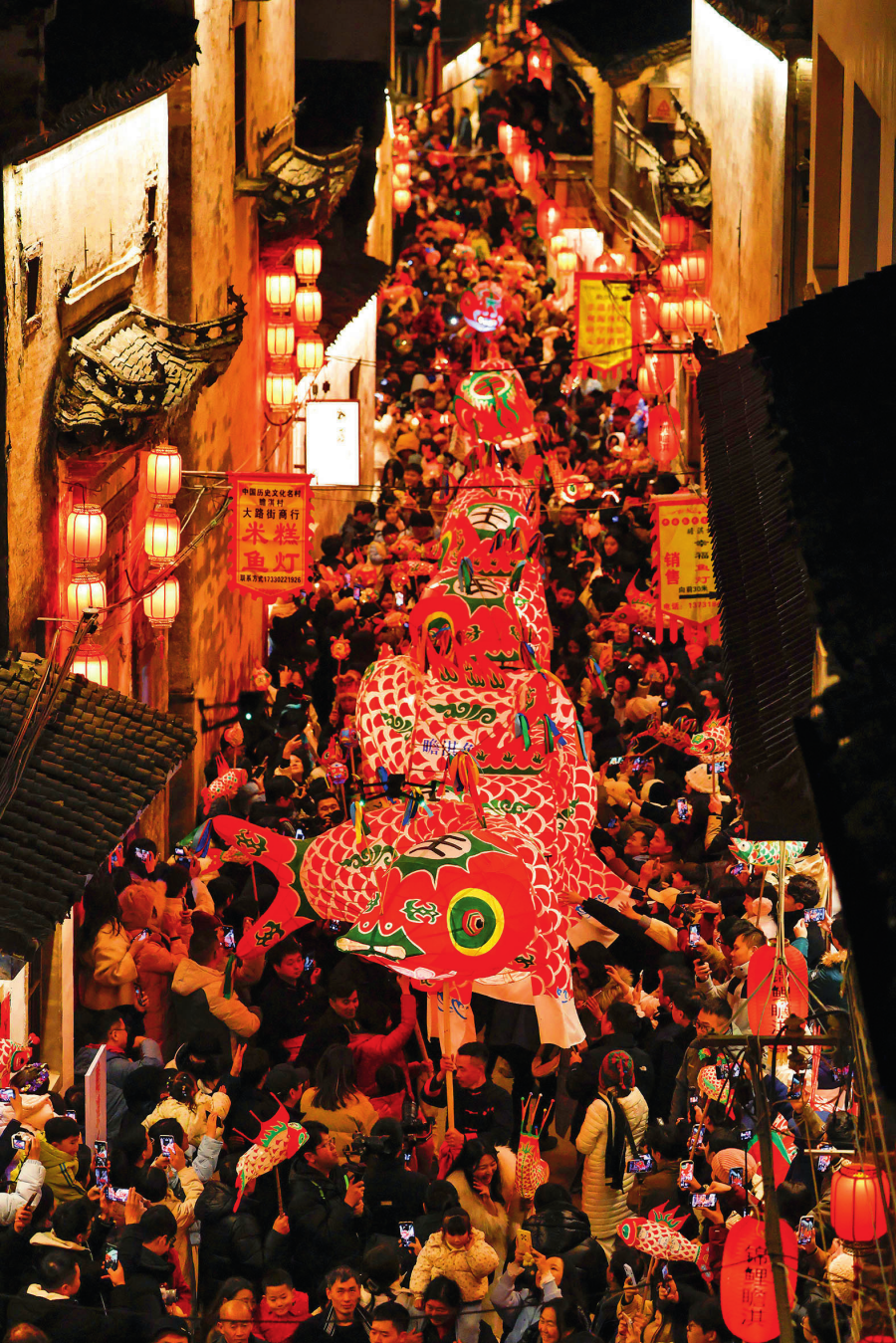 在安徽省黃山市歙縣北岸鎮瞻淇村,村民舞動非遺魚燈,吸引了眾多游客(2024 年 12 月 31 日攝) 施亞磊攝 / 本刊