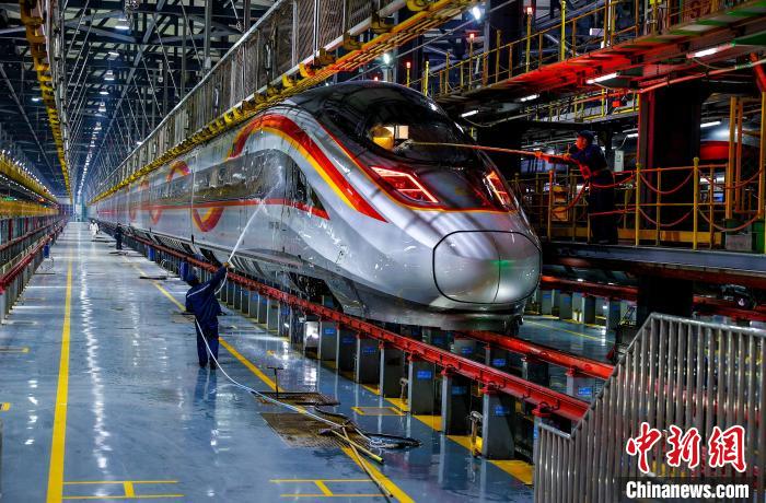 圖為修理庫中,工作人員清洗動車。 張暢 攝