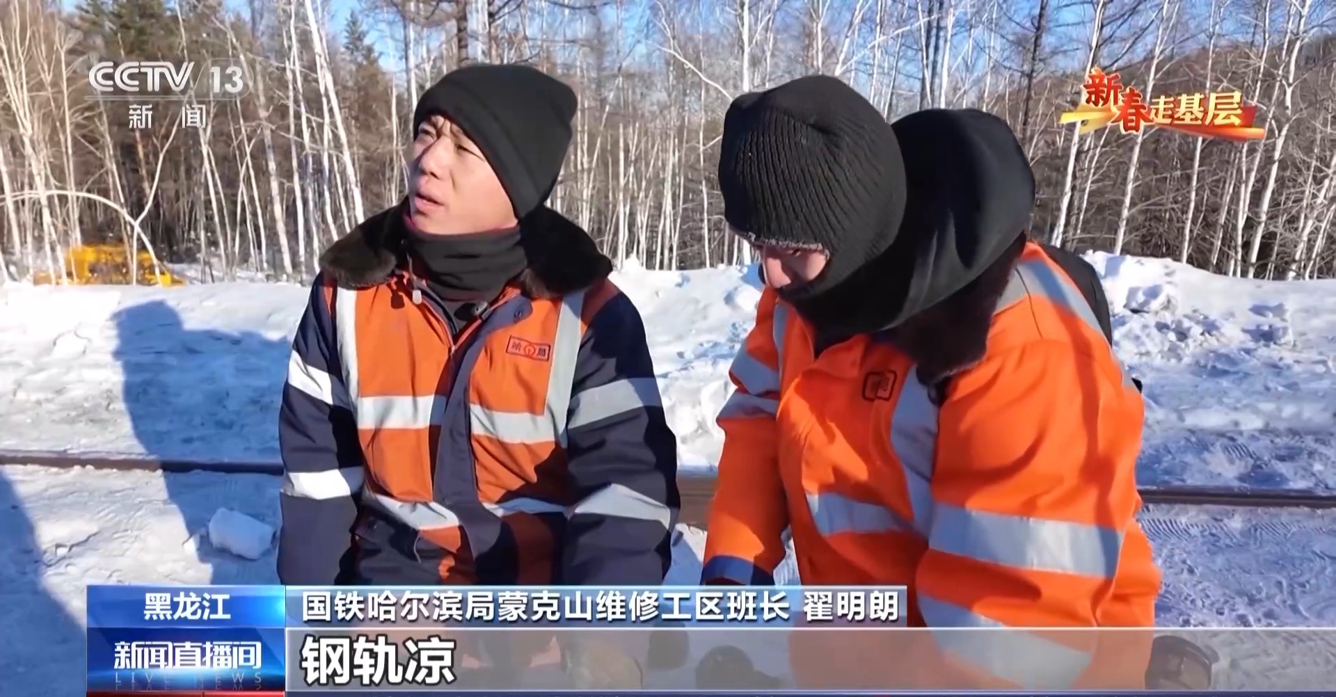 國鐵哈爾濱局蒙克山維修工區班長 翟明朗:冬天因為氣溫比較低,鋼軌涼,然后手熱,它碰著鐵直接就粘住了。不能直接往下拽,容易給皮拽下來。
